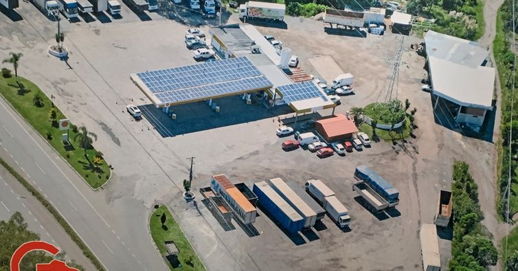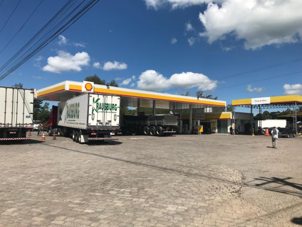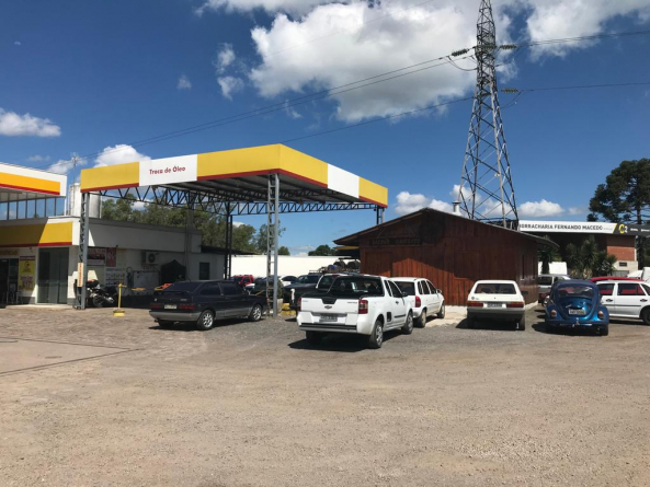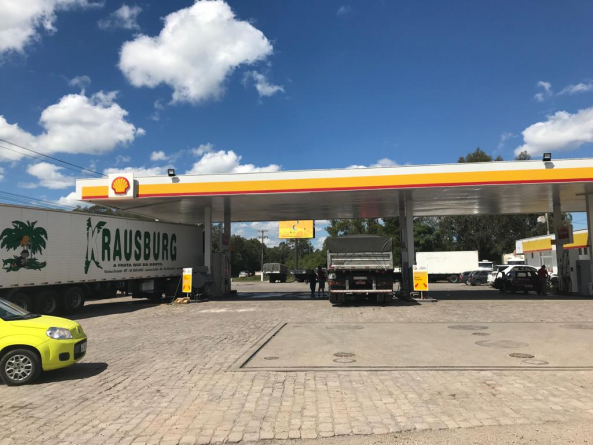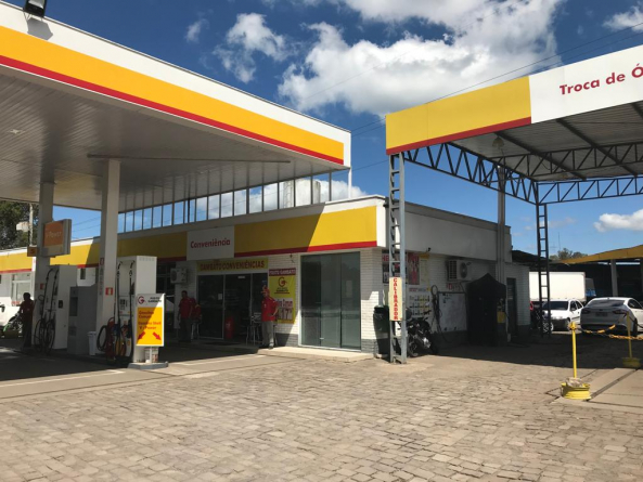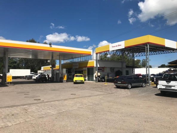 Posto bandeira SHELL, com loja de conveniência, restaurante, e estacionamento para clientes.
