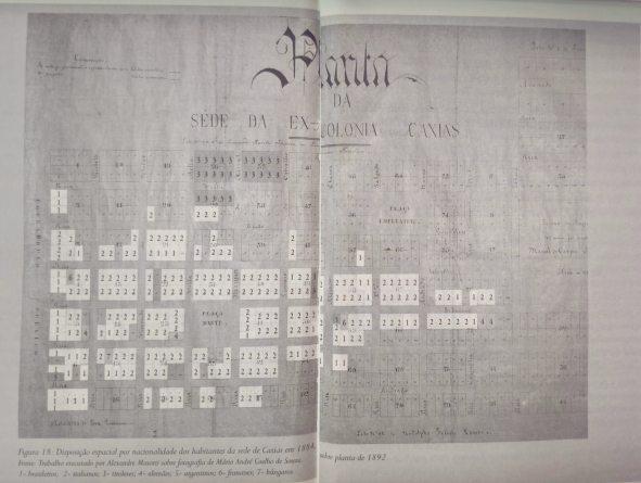Imagem reprodizida do livro "Formação Urbana de Caxias do Sul” de Roberto Nascimento, onde destaca as etnias brasileiros, italianos, tiroleses, alemães, argentinos, franceses e húngaros.