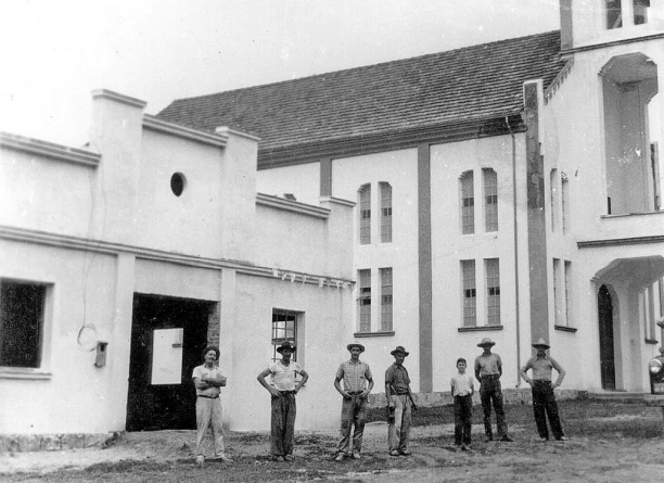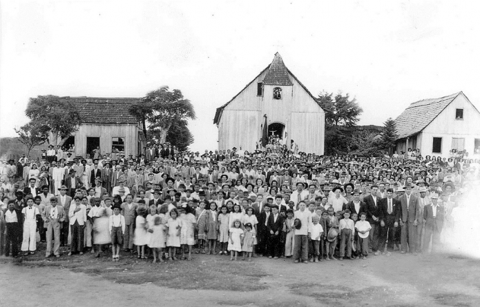 Igreja contruida em meados de 1930. Nesta foto podemos observar a diversidade étnica da região Fotografo desconhecido. Acervo Rena Daneluz.