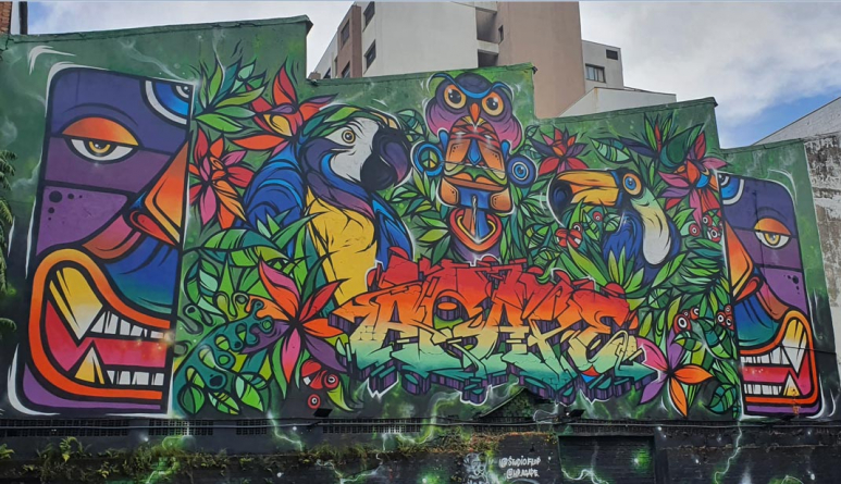 O mural possui duas obras que se destacam: a primeira a ser concluída traz a figura de um guardião indígena rodeado de elementos da flora e da fauna, dos olhos atentos de uma coruja às cores exuberantes das araras e dos frutos do guaranazeiro Foram quatro dias de trabalho para cobrir o paredão de 280 metros quadrados, inaugurado em junho, mais de 60 litros de tinta e 250 latas de spray; a segunda é em defesa da natureza com tucanos, araras, coalas, serpentes e uma onça pintada. Tem aproximadamente 160 metros quadrados e foi pintada no mesmo terreno, como uma extensão do primeiro. A obra contou com apoio do artista Henrique Padilha.