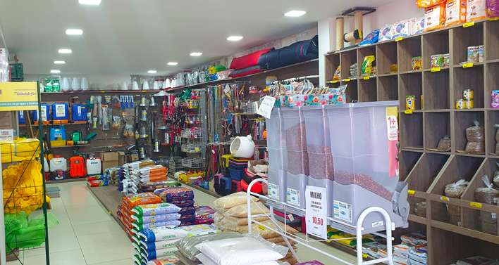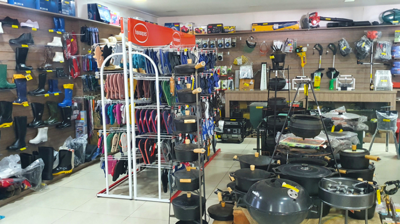 No espaço destinado à agropecuária, além de ferramentas, sementes e outros artigos focados na agricultura, ainda há produtos para pet, itens para pesca, panelas especiais e fogareiros. Botas de borracha, havaianas e tudo que uma pessoa precisa para trabalhar no campo fazem parte do mix de produtos.