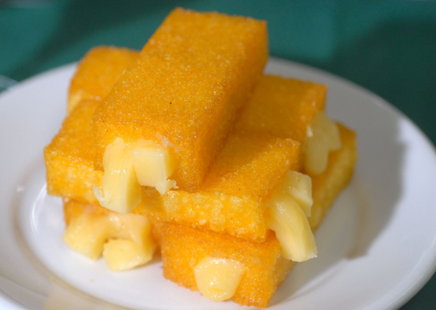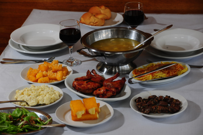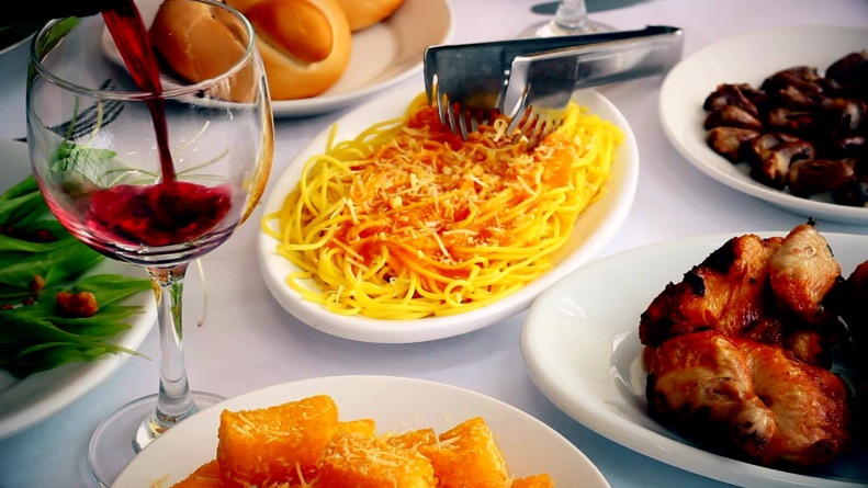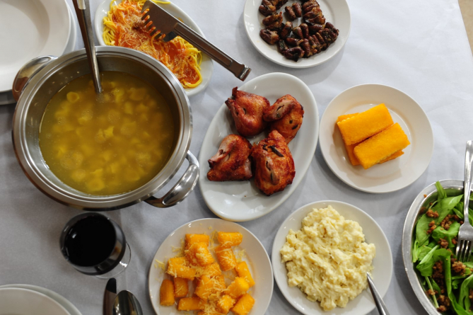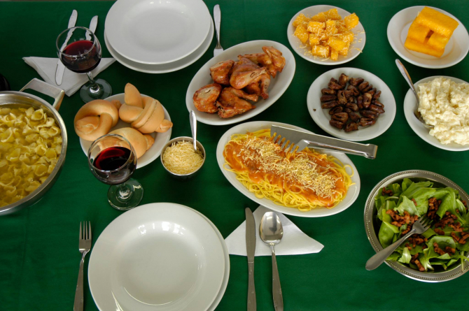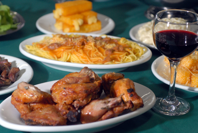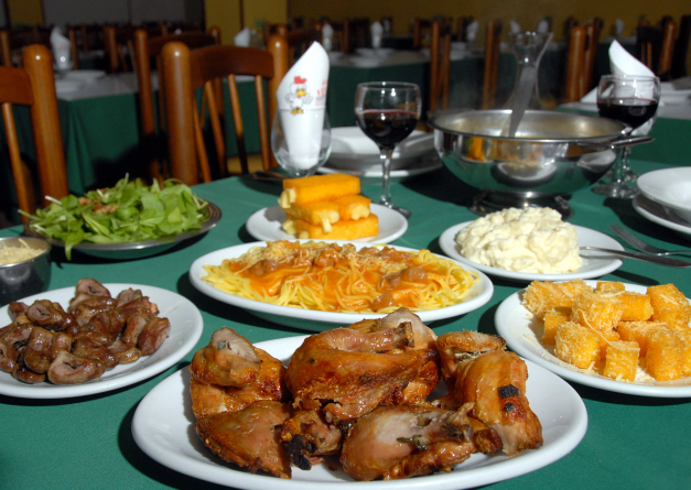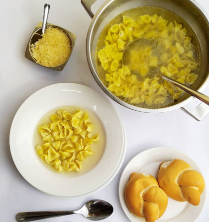Sopa de Agnolini, pão, espaguete com molho de miúdos de galinha, polenta frita, salada de