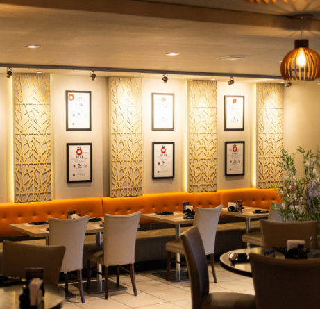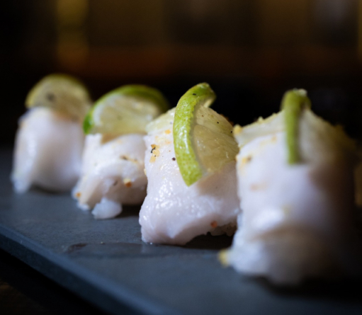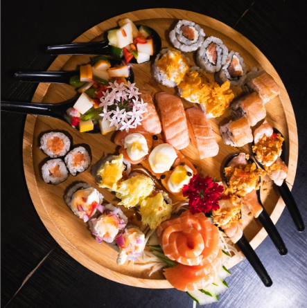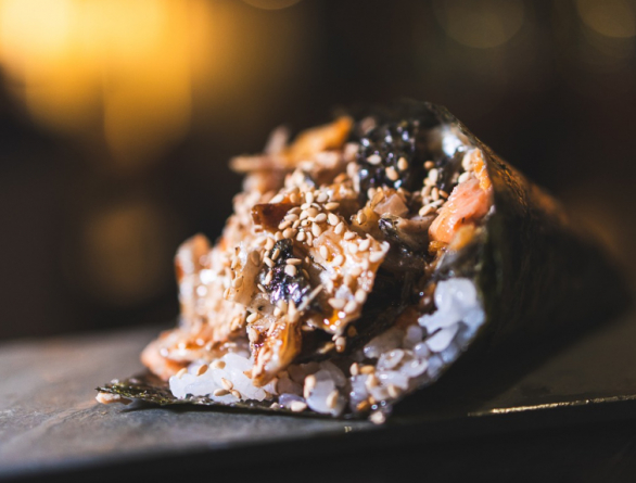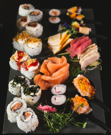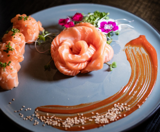Cozinha japonesa gourmet inventiva com coquetéis chamativos em ambiente contemporâneo intimista e convidativo.