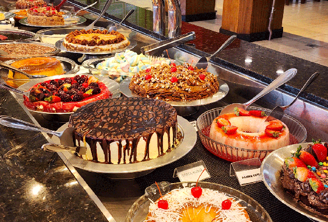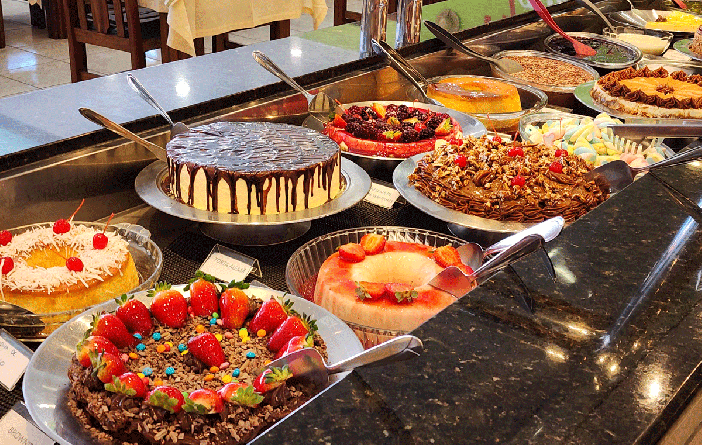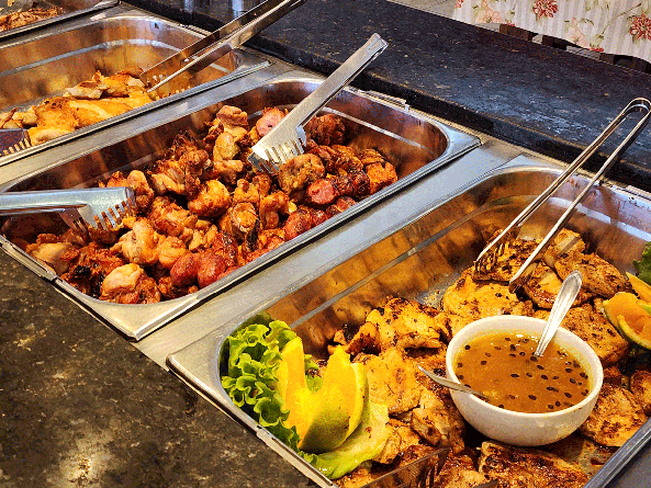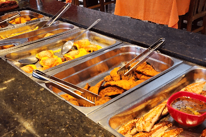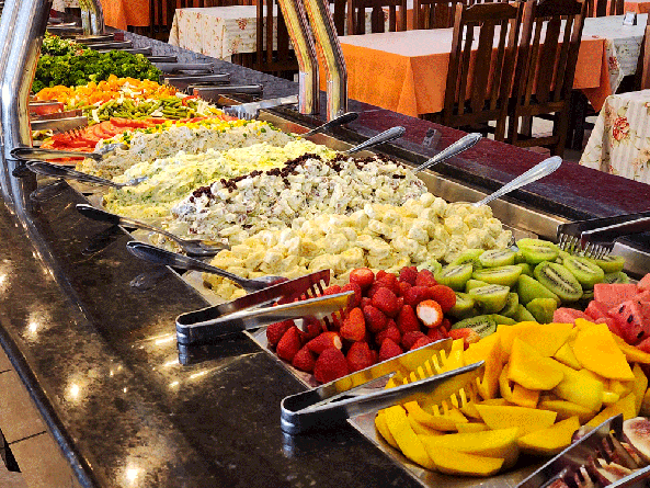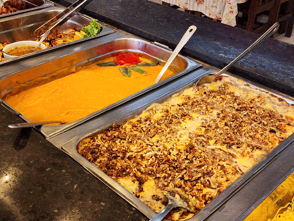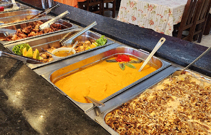 Restaurante com buffet ao meio dia com variedade de saladas, massas, carnes e acompanhamentos com toque caseiro, sobremesas e atmosfera casual.