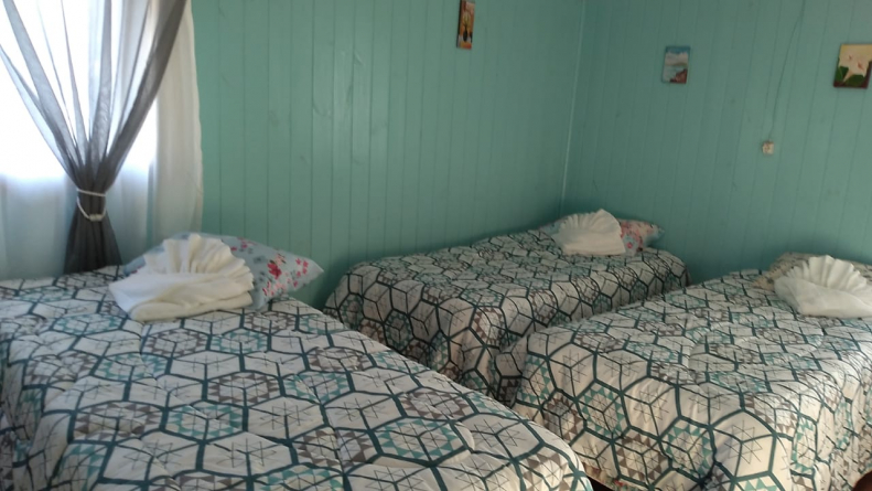 Oferece 6 camas de solteiro e uma cama de casal, esta com massageador. O quarto é conjugado com banheiro.