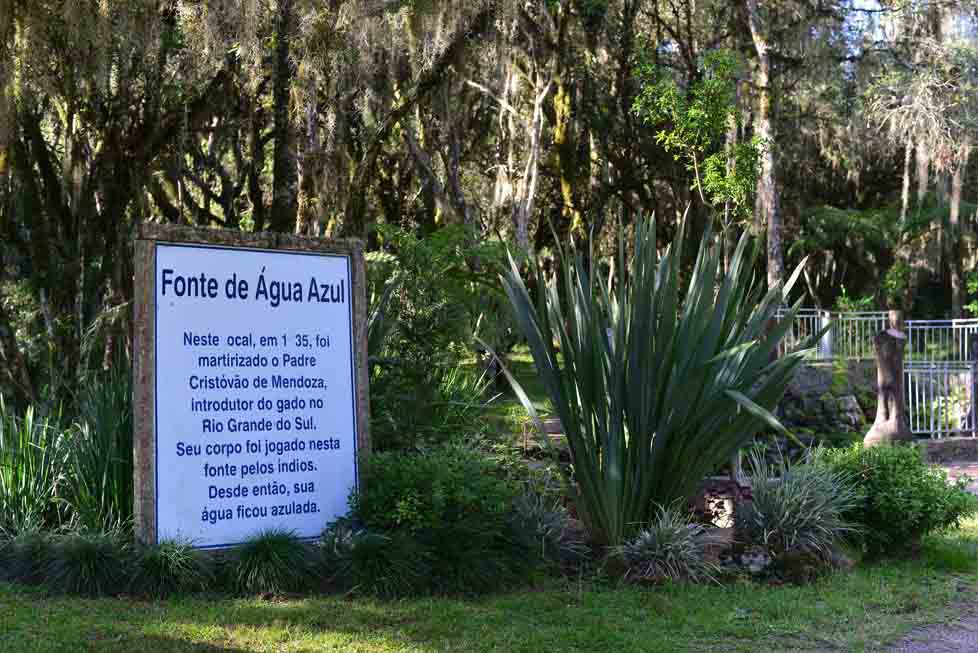 O Parque Água Azul é o local onde acredita-se que foi martirizado Cristóvão de Mendoza, um padre jesuíta que trabalhou nas missões sul-americanas no séc. XVII. Foi fundador dos Sete Povos das Missões (São Miguel Arcanjo). É considerado o introdutor do gado no Rio Grande do Sul. Seu martírio pelos índios, em 1635, teve várias consequências, entre elas a guerra entre as tribos Guaranis e Kaigangs, a junta dos feiticeiros na região e a saída dos Espanhóis do território gaúcho. A Fonte de Água Azul é declarada Patrimônio Histórico do Rio Grande do Sul pela Lei Estadual 12.356/2004.