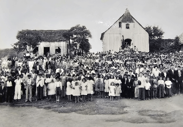 Foto em frente à primeira igreja de Vila Oliva, na década de 1930. Acervo Renan Daneluz. Fotógrafo não identificado.
