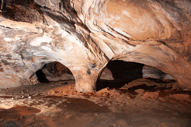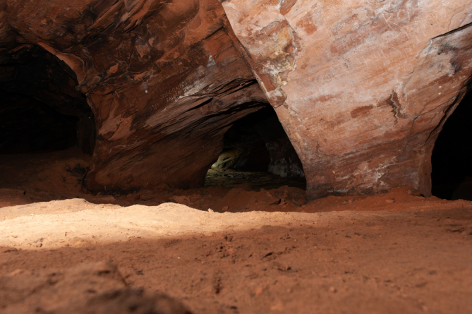 As grutas originadas nas rochas sedimentares areníticas da Formação Botucatu, como a Gruta dos Índigenas, possuem maior susceptibilidade à ação dos processos de intemperismo e erosão a partir da linha de fraqueza da rocha e da dissolução e carreamentos dos minerais.Podem estar geneticamente relacionadas à diferença de resistência da rocha sedimentar em relação à rocha vulcânica junto ao topo ou ainda a diferença à resistência intempérica dentro do próprio pacote sedimentar.