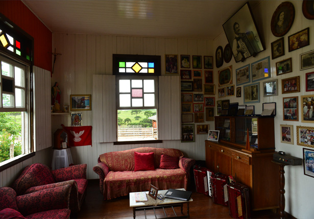 Gilnei José Bertussi é o responsável por manter viva e acessível a todos a história musical da Família Bertussi. Os Irmãos Bertussi, Adelar e Honeyde, foram os que mais se destacaram, mas o talento para a música surgiu antes, com o pai deles, e segue com Gilnei, que também é músico. “O meu avô, Fioravante Bertussi, começou com a música e construiu essa fazenda, entre 1932 e 1935. Eu faço questão de manter como sempre foi, inclusive nunca mudo a cor da casa, permanece laranja, como ele escolheu”, conta.