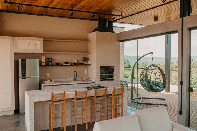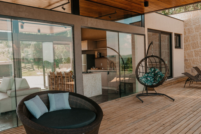 Deu certo, e o casal já está construindo uma segunda casa na propriedade. Mas aqui uma informação é muito importante: de uma construção não se enxerga a outra. Ketlin faz questão de reforçar que a privacidade é total. Mesmo quando a segunda casa estiver pronta, quem se hospedar na Villa Montegrappa não terá contato com outros hóspedes. “Tem um cofre na entrada que é ativado pelo hóspede. Ali, ele encontra a chave da casa e o controle do portão. Não fala com ninguém. É realmente a sensação de estar indo para a sua casa no interior”, complementa.