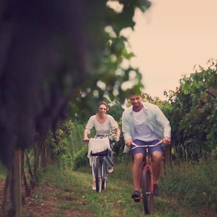Já se imaginou pedalando em meio aos vinhedos, sentindo o perfume da uva e apreciando paisagens lindíssimas? Este sonho pode se tornar realidade. Você pode alugar bicicletas aqui na Casa Perini e viver esta experiência. O passeio é autoguiado, ou seja, os ciclistas completam a experiência sem a presença de um guia. O nível de dificuldade do trajeto é intermediário. O percurso tem aproximadamente 2,3 km com parte em asfalto, parte em estrada de chão, subidas e descidas. As roupas esportivas são as adequadas para o passeio. No meio do percurso, o turista pode parar para fazer um piquenique no Belvedere Casa Perini, para apreciar a paisagem e a companhia, junto de um vinho, espumante ou suco e uma tábua de frios.