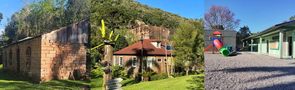 Escola 19 de Abril, considerada a primeira de Caxias do Sul, surgiu após a chegada dos imigrantes pomeranos e alemães na década de 1860. Funcionou até 2024 e, hoje, aguarda transformação em creche. A direita foto da Rampa Sul, tradicional ponto de decolagem de parapente e asa delta no distrito de Vila Cristina, em Caxias do Sul. Com vista panorâmica do Vale do Rio Caí, é um local emblemático para os praticantes de voo livre.
