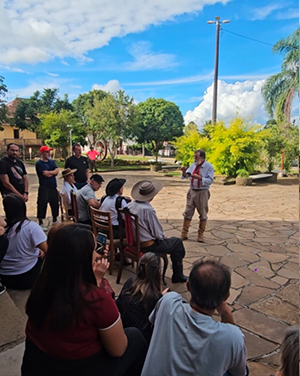 Na próxima parada, novamente foi Guadalupe quem repassou as informações. Dentro da Igreja Matriz de Criúva, os participantes conheceram um pouco da história da construção do templo. Na sequência, quem assumiu as falas foi Jorge de Oliveira Rodrigues, conhecido como Boca de Sino e uma verdadeira lenda da Criúva. Músico e trovador premiado, ele cantou e contou histórias. Primeiro, relembrou tropeadas em que esteve junto com o seu pai e o seu avô, citando que elas costumavam ter entre 20 e 30 mulas de cargas. Depois de citar desafios e alegrias dessa atividade, relatou uma curiosidade. O seu avô costumava recolher paus de madeira que encontrava no caminho, o que lhe rendeu o apelido de Juca Pau. Com esse material, esculpia objetos, exercitando o seu talento para o artesanato em madeira.