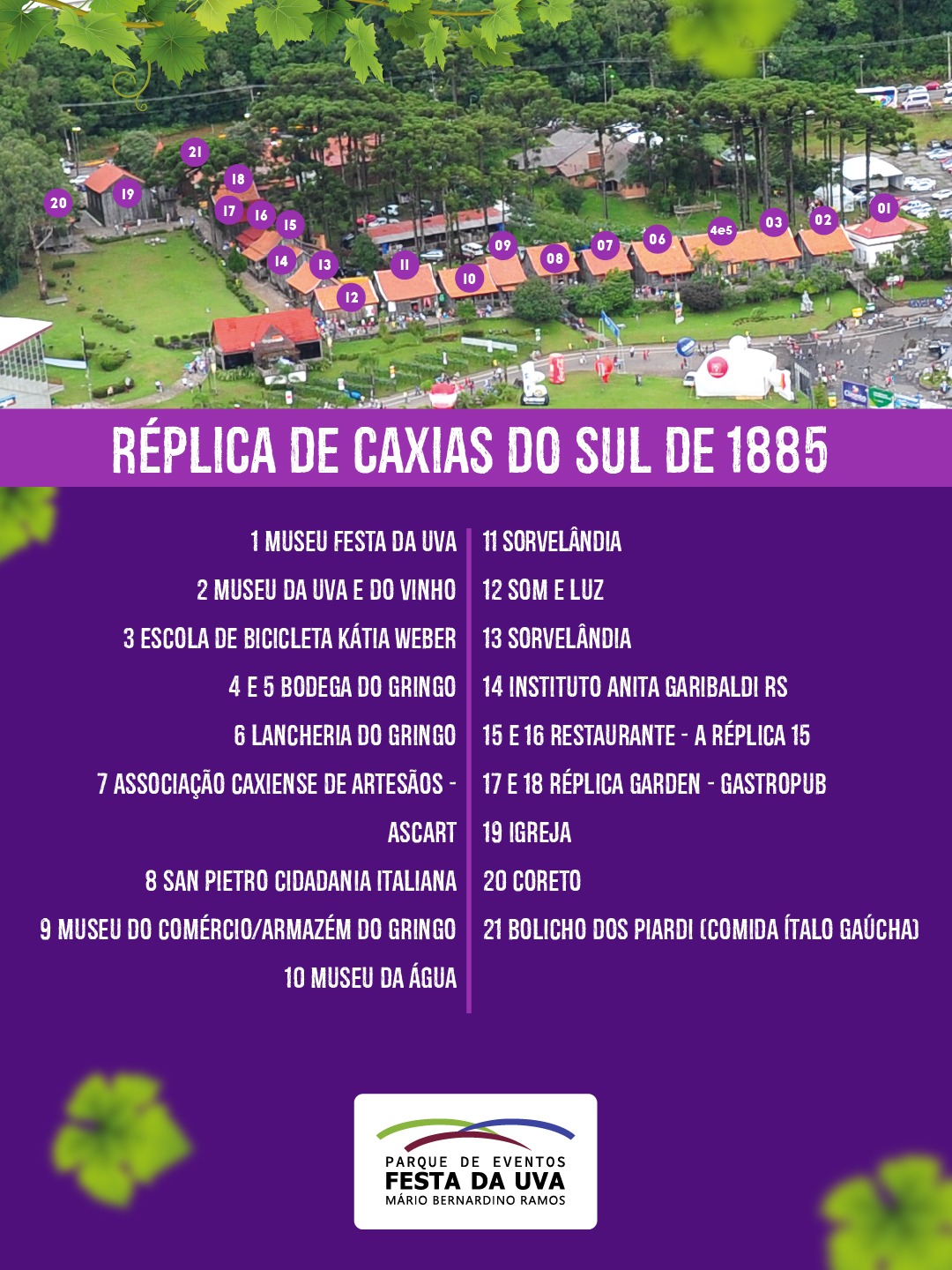 Diversos pontos turísticos importantíssimos de Caxias do Sul estão localizados no interior do local, como a Réplica de Caxias de 1885, que remonta com perfeição um esboço do município daquela época, nelas estão localizados diversos museus e espaços gastromônicos, confira na imagem.
